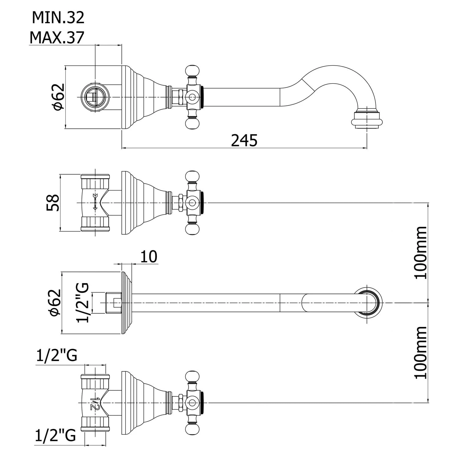 Eigenschaften: Ausladung 24,5 cm Luftsprudler M22 x 1 Wandrosette Ø 6,2 cm Wandrosette für Auslauf Ø 6,2 cm Anschluss 1/2″