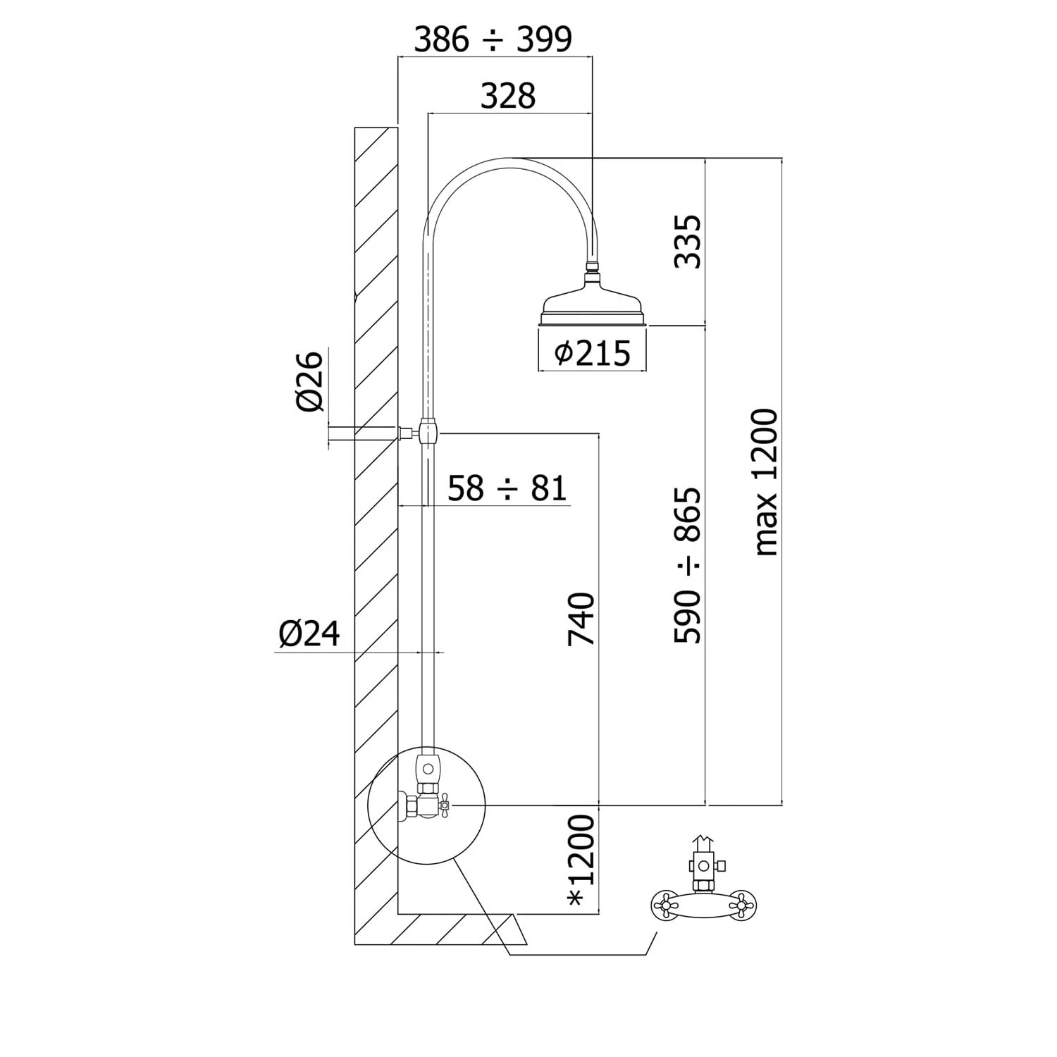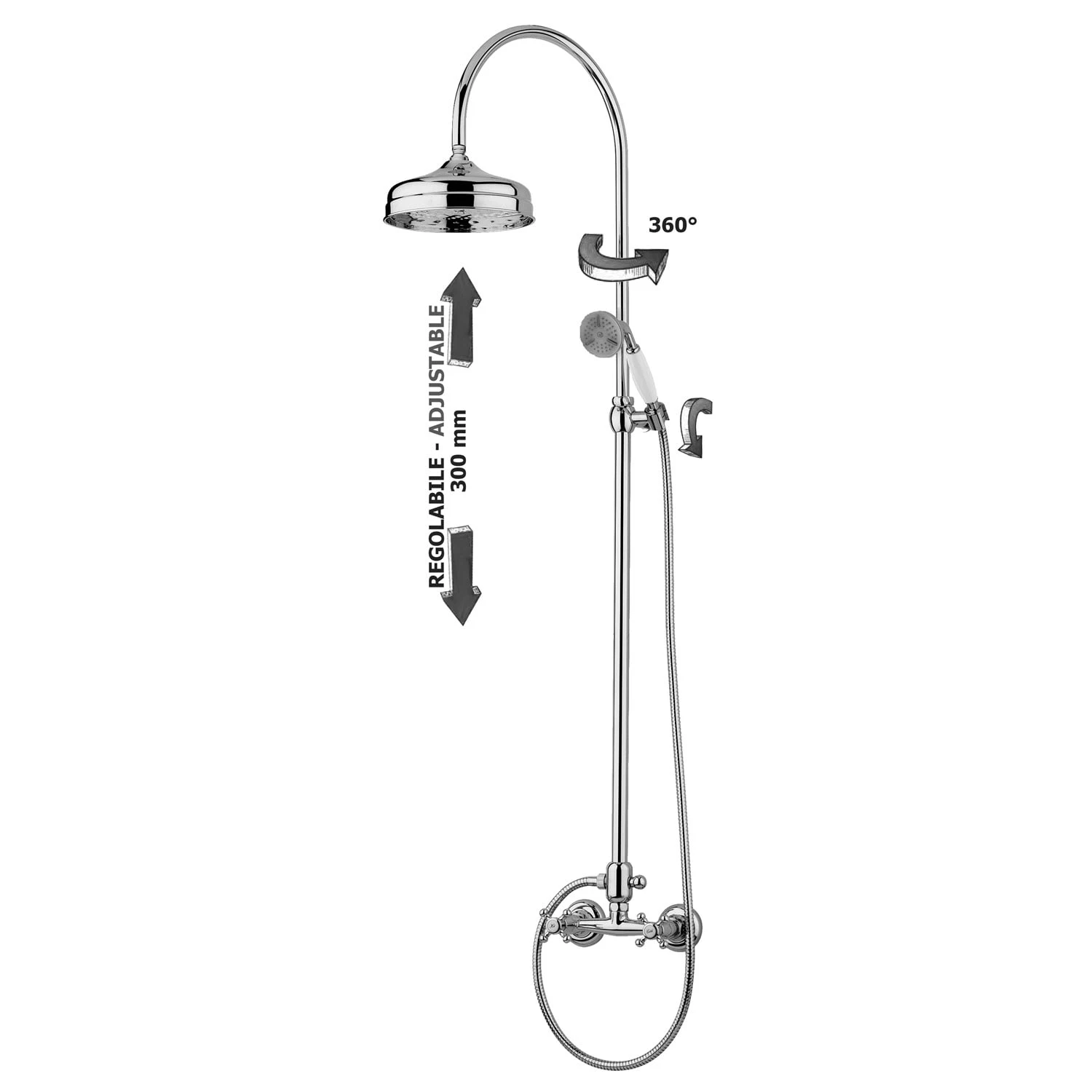 Eigenschaften: Ausladung Standbrause 33 cm Handbrause Retro (Einzelstrahl) Kopfbrause aus Metall Ø 21.5 cm Metall-Flexschlauch 150 cm Das Steigrohr ist fertigungsbedingt nicht kürzbar