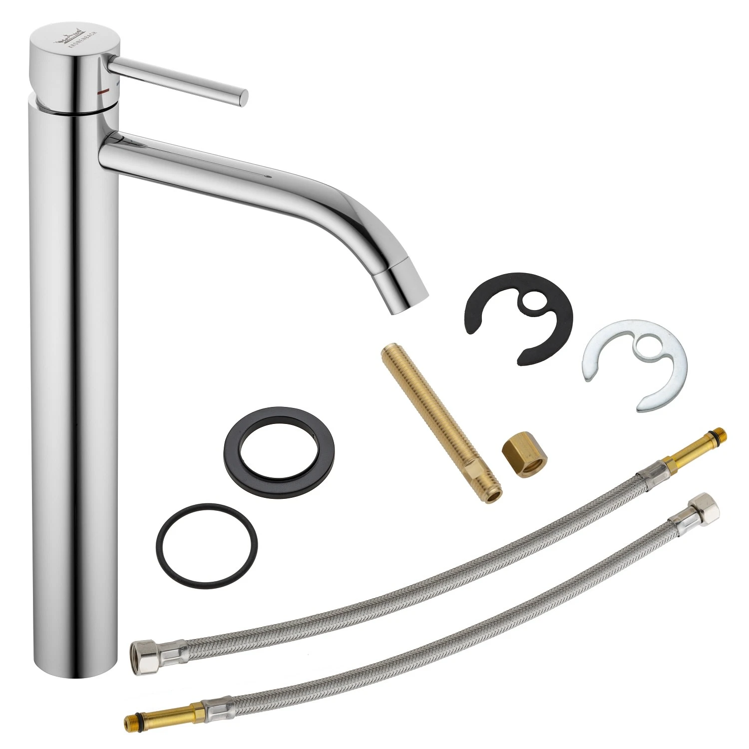 Eigenschaften: ohne Ablaufgarnitur Luftsprudler M18 x 1 Kronenbach Keramikkartusche mit flexiblen Edelstahl-Anschlussschläuchen 3/8″ DVGW zertifiziert (KTW zugelassen) 45 cm