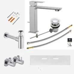 bestehend aus: 1x Kronenbach Quara 3.0 Waschtisch-Einhebelmischer mit Ablaufgarnitur 2x Kronenbach Design-Eckventil 1x Kronenbach Design-Siphon 1x Sturotec Waschtischbefestigungs-Set M10 1x Sturotec Schallschutz-Set 84 cm für Waschtisch Waschtisch-Einhebelmischer mit Ablaufgarnitur: Ein klares Statement für Stil und Eleganz. Die Armaturenserie Quara 3.0 überzeugt mit einer ausdrucksstarken Designsprache und einer klaren Linienführung, die gezielt anspruchsvolle Akzente setzt. bis zu 50% Wassersparen durch begrenzte Durchflussmenge von max. von 5 l/min, schützt die Umwelt und ihr Budget. der verdeckte Luftsprudler erzeugt einen sanften und vollen Wasserstrahl einfache Bedienung dank leichtgängier und langlebiger Keramikmischkartusche inklusive leicht zu betätigender Zugstangen-Ablaufgarnitur (?) Zugstangen-Ablaufgarnitur Excenter-Garnitur ist der Ablauf unten im Waschbecken. flexibele Anschluss-Schläuche (G3/8″) komfortable Nutzung durch großen Bewegungsfreiraum unter dem Auslauf einfache und präzise Montage durch hochwertige Befestigungtechnik robuste Hochglanz verchromte Oberfläche Design-Eckventile: mit 90° keramischem Innenoberteil mit Längenausgleich Messing verchromt 3/8″ x 10 mm Abgang Design-Siphon: Wandrosette Ø 6,5 cm Länge des Tauchrohrs bis max. 8,5 cm Universalanschluss 1 1/4″ Waschtischbefestigungs-Set: 2 Nylon-Dübel 2 Schraubstutzen 2 Unterlegscheiben 2 Muttern 2 Abdeckkappen Schallschutz-Set: Schalldämmplatte recyclingfähig aus geschlossenzelligem PE-Schaum zur Unterbrechung von Schallbrücken zwischen Wandfliesen und Keramikobjekten
