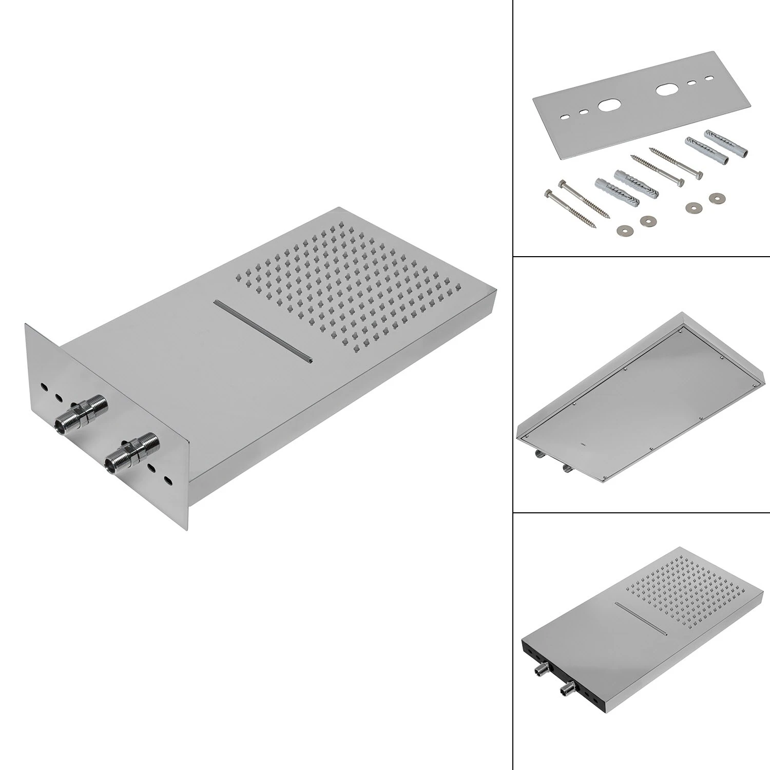 bestehend aus: Thermostat Unterputz für 3 Verbraucher, eckige Ausführung (Art.-Nr. 19046003CR): B: 15 H: 18 cm Material: Messing gleichzeitige Nutzung mehrerer Verbraucher mit Smart Push Funktion per Knopfdruck (Ein-/Aus-Taste) Sicherheitssperre bei 38C° Universal-Grundkörper Unterputz ( Art.-Nr. 01900190KBN ): Einbautiefe: min. 8 – max. 11 cm Material (Anschlussblock): Messing 2 Zuläufe und 3 Abgänge in 1/2″ geeignet für die Verwendung im Nass- und Trockenbau inkl. Dichtmanschette einfache und schnelle Montage Wartungs- und Störungsarbeiten können jederzeit ohne Fliesenschaden ausgeführt werden Kopfbrause 50 x 25 cm mit 2 Strahlarten eckig ( Art.-Nr. KBMBBPRBOR250-2 ): Material: Edelstahl spiegelpoliert Strahlarten: Regen, Wasserfall Durchflussmenge 17 Liter/min. bei 3 bar inkl. Silikonnoppen mit Antikalkausstattung Anschluss 2x 1/2″ Aussengewinde inkl. „EasyPlug“: Anschrauben. Aufstecken. Festziehen. In 3 Schritten fertig montiert. Wandanschlussbogen mit Brausehalter eckig ( Art.-Nr. 26370000KB ): Wandrosette Ø: 5,5 x 5,5 cm, Ausladung: 7 cm mit Rückflussverhinderer verdeckter Anschluss 1/2″ Stabhandbrause eckig ( Art.-Nr. 27500004KB ): Material: Messing verchromt mit Antikalkausstattung (Noppen in grau) Strahlarten: 1 Durchflussmenge 10 Liter/min. bei 3 bar Anschluss 1/2″ Brauseschlauch 125 cm ( Art.-Nr. 28272000KB ): Material: Kunststoff verstärkt mit Polyesterfäden (Kreuzgewebe), 5-lagig Anschluss: Drehkonus ½” x Konusmutter ½” mit Verdrehschutz