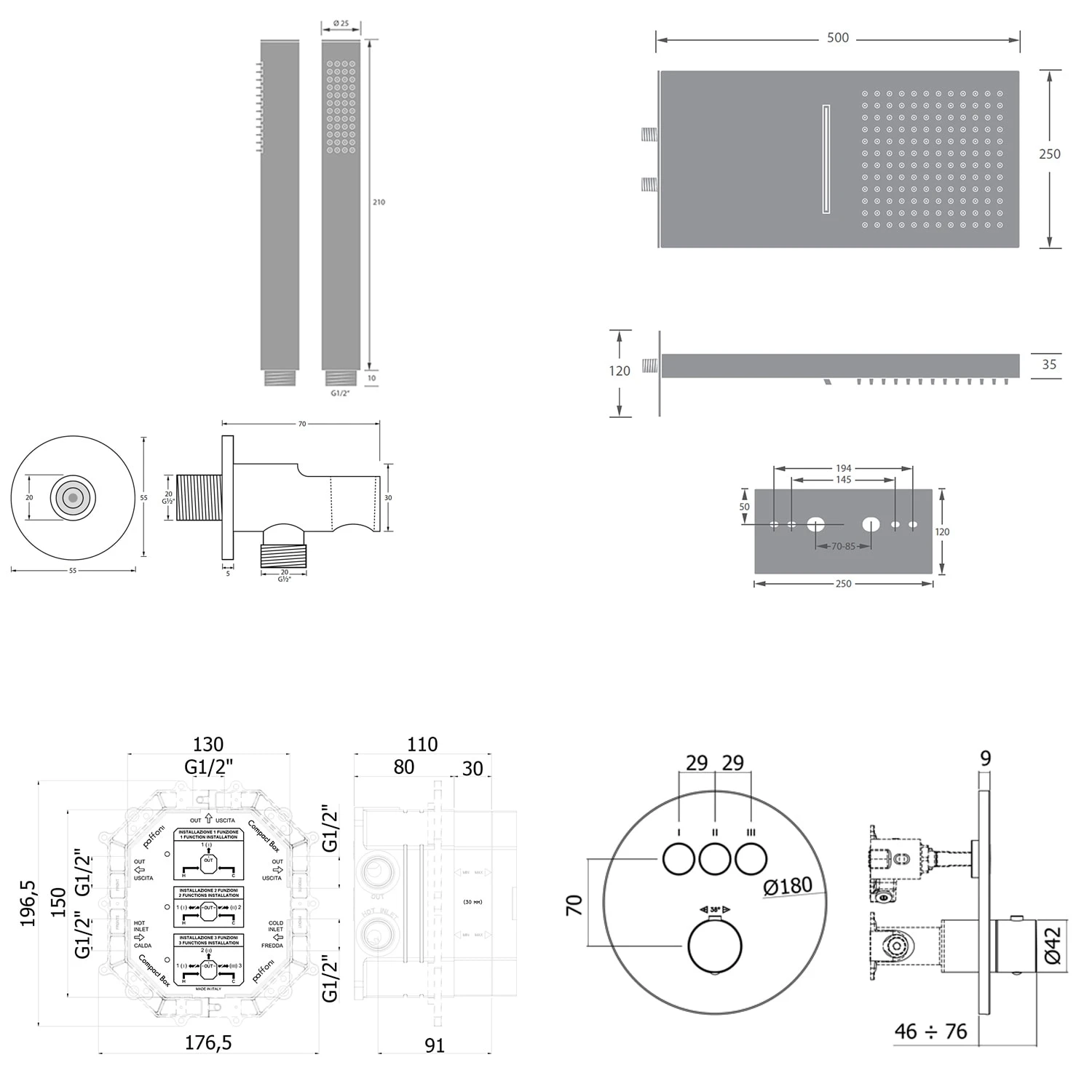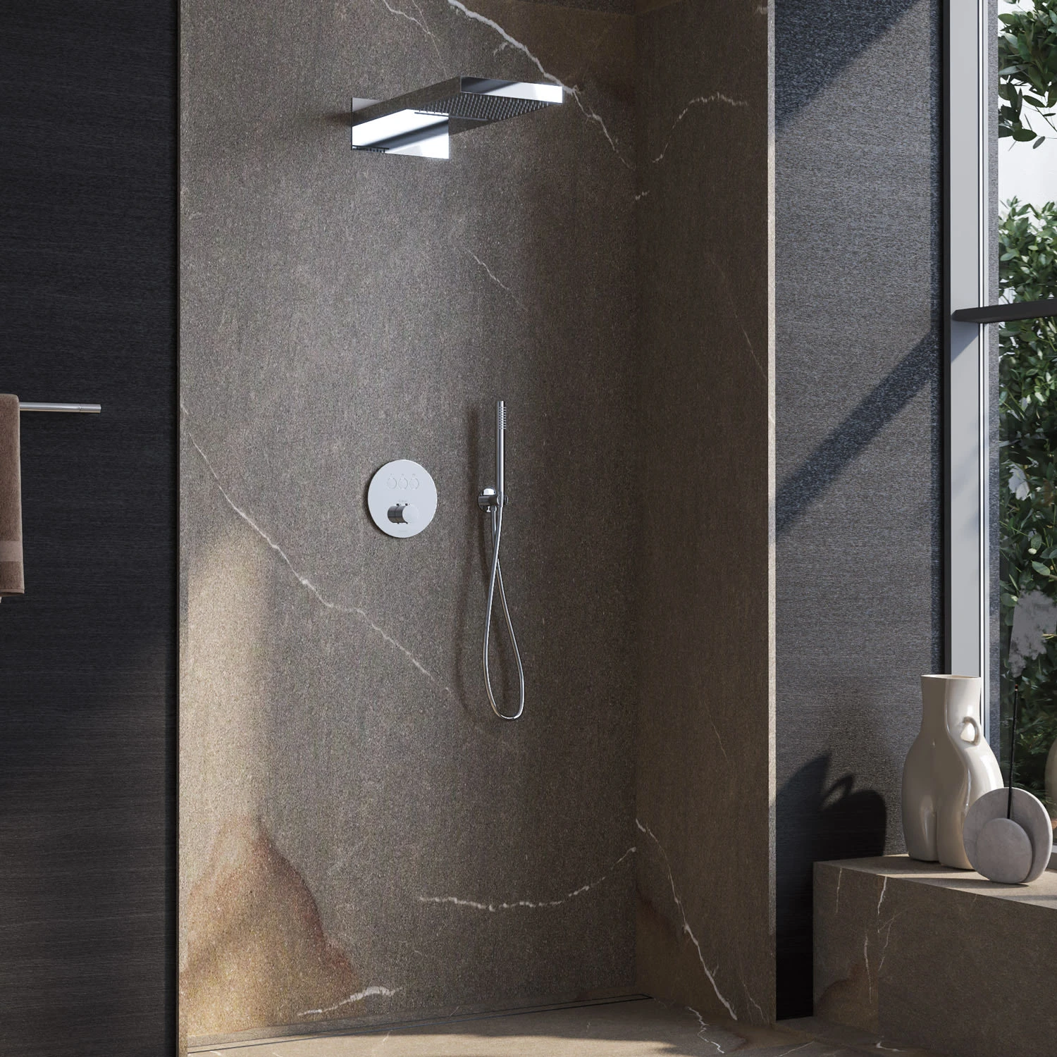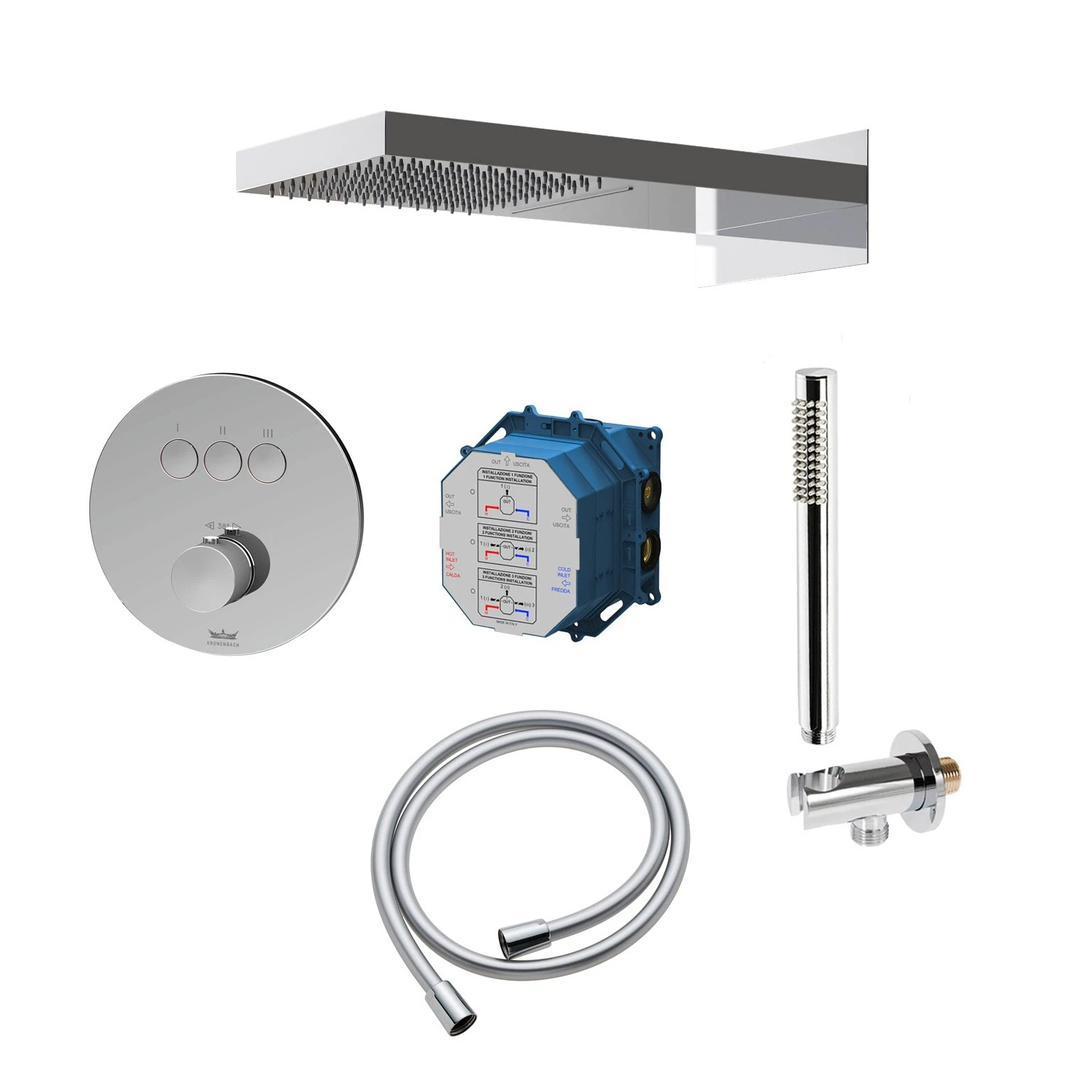 bestehend aus: Thermostat Unterputz für 3 Verbraucher, runde Ausführung ( Art.-Nr. 19044003CR ): Ø: 18 cm Material: Messing gleichzeitige Nutzung mehrerer Verbraucher mit Smart Push Funktion per Knopfdruck (Ein-/Aus-Taste) Sicherheitssperre bei 38C° Universal-Grundkörper Unterputz ( Art.-Nr. 01900190KBN ): Einbautiefe: min. 8 – max. 11 cm Material (Anschlussblock): Messing 2 Zuläufe und 3 Abgänge in 1/2″ geeignet für die Verwendung im Nass- und Trockenbau inkl. Dichtmanschette einfache und schnelle Montage Wartungs- und Störungsarbeiten können jederzeit ohne Fliesenschaden ausgeführt werden Kopfbrause 50 x 25 cm mit 2 Strahlarten eckig ( Art.-Nr. KBMBBPRBOR250-2 ): Material: Edelstahl spiegelpoliert Strahlarten: Regen, Wasserfall Durchflussmenge 17 Liter/min. bei 3 bar inkl. Silikonnoppen mit Antikalkausstattung Anschluss 2 x 1/2″ Aussengewinde inkl. „EasyPlug“: Anschrauben. Aufstecken. Festziehen. In 3 Schritten fertig montiert. Wandanschlussbogen mit Brausehalter rund ( Art.-Nr. 28628002KB ): Wandrosette Ø: 5,5 cm, Ausladung: 7 cm mit Rückflussverhinderer verdeckter Anschluss 1/2″ Stabhandbrause rund ( Art.-Nr. 27400000KB ): Ø 2,4 L: 21 cm Material: Messing Strahlart: Regen mit „EasyClean“ Gummidüsen Anschluss 1/2″ Brauseschlauch 125 cm ( Art.-Nr. 28272000KB ): Material: Kunststoff verstärkt mit Polyesterfäden (Kreuzgewebe), 5-lagig Anschluss: Drehkonus ½” x Konusmutter ½” mit Verdrehschutz