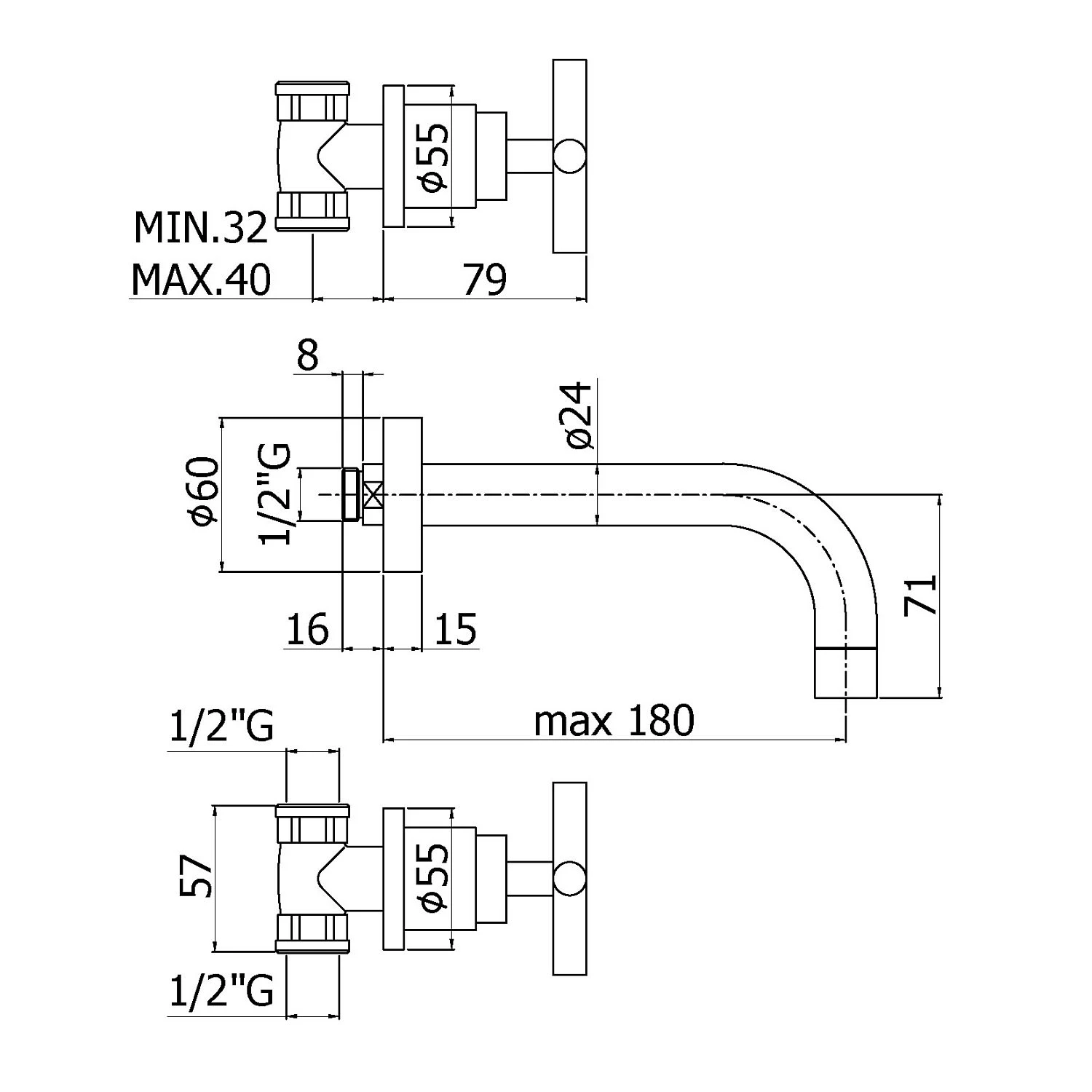 bestehend aus: 2 Ventile 1/2″ für kalt und warm 1 Auslauf Anschluss 1/2″ Rosetten und Kreuzgriffe