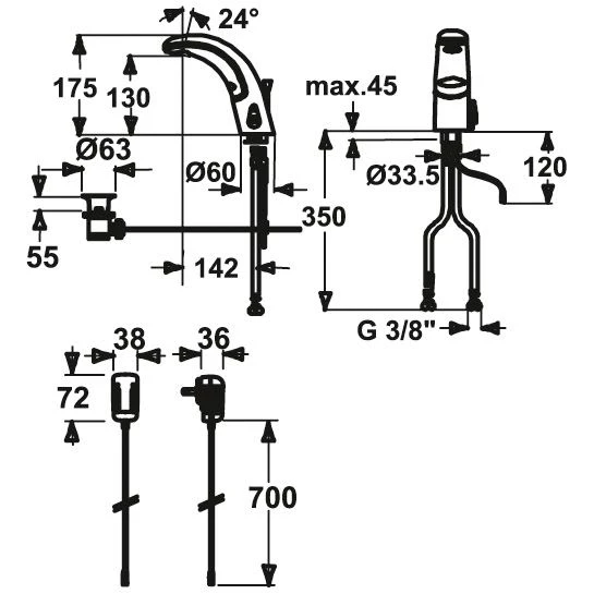 Eigenschaften: Automatik gesteuert Infrarotsensorik A10 mit Mischung Mikroprozessor-Steuerung Wassernachlaufzeit einstellbar (1 Sekunde Werkseinstellung) Kurz-Aus (Reinigungsmodus) einstellbar Dauer-Ein (Befüllen) Laufzeit einstellbar Sensorempfindlichkeit permanent automatisch selbsteinmessend 24-Stunden-Hygienespülung aktivierbar Auslauf fest Neoperl® Cascade® Magnetventil flexible Anschlussschläuche Befestigung mit Stehbolzen M8 x 1 Tischbohrung ø 3,5 cm inkl. Steckernetzteil 100-240 V / Betriebsspannung 6 V Auslaufmenge 6 l/min (3 bar) Armaturengeräuschgruppe I