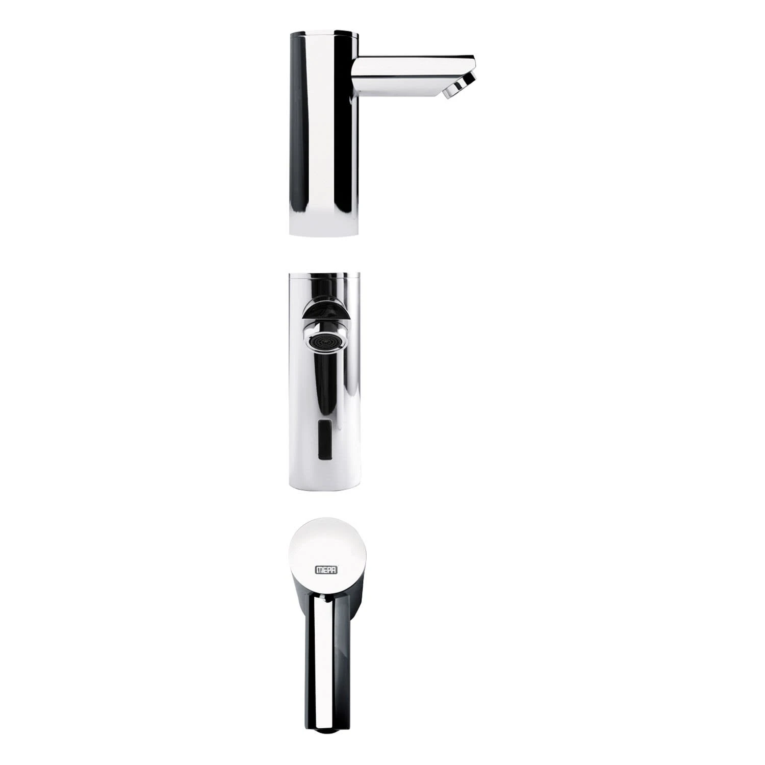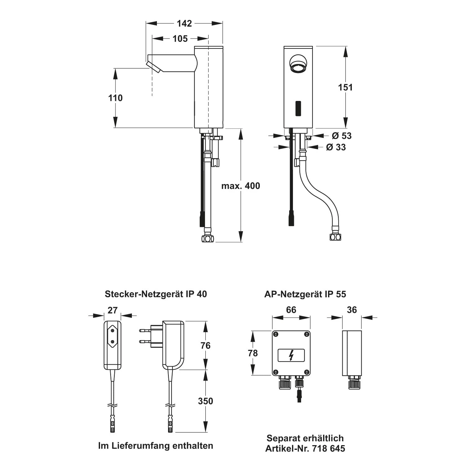 Eigenschaften: berührungslose, infrarotgesteuerte Waschtischarmatur ohne Mischung für die Entnahme von kaltem und vorgemischtem Leitungswasser aus dem Trinkwassernetz Einsatzbereich: Innen für Lochstanzung D 35 mm zur Montage auf Waschtisch oder Arbeitsplatte (Stärke 0,2 – 4 cm) Material: Messing Netzbetrieb Armaturengruppe I nach DIN EN 200 Schutzart IP 55 zur Standmontage berührungslos Durchflussbegrenzer 6 l/Min. vandalensicher Strahlregler M24, diebstahlgesichert Infrarot-Näherungselektronik bistabiles Magnetventil 6 V Betriebsdruck 0,5 – 8 bar max. Auslauftemperatur 60 C Nachlaufzeit einstellbar von 0,5 – 10 Sek. (Werkseinstellung 1 Sek.) automatischer Auslaufstopp einstellbar von 30 – 180 Sek. (Werkseinstellung 60 Sek.) zuschaltbare periodische Hygienespüllung, einstellbar in 5 Intervallstufen von 24 h bis 120 h Dauer Hygienespülung einstellbar von 15 – 120 Sek. Reinigungsstopp Dauer 60 Sek. einstellbare Funktionen über Sanicontrol-Fernbedienung SC 900: Nachlaufzeit, Auslaufstopp, Hygienespülung, Ansprechbereich für Edelstahlbecken geeignet nachrüstbar Lieferumfang: 1 Armatur mit integrierter Infrarot-Näherungselektronik und Magnetventil Befestigungsmaterial 1 flexibler Anschlussschlauch R 3/8″, Länge 40 cm 1 Rückflussverhinderer 1 Schmutzfangsieb 1 Flachdichtung 3/8″ 1 Stecker-Netzteil 230 VAC/6 VDC 1 Montageschlüssel für Strahlregler 1 Sanicontrol-Fernbedienung SC 900 Hinweis: ohne Ablaufgarnitur geeignet für druckfeste, elektronische Durchlauferhitzer nicht geeignet für druckfeste, hydraulische Durchlauferhitzer