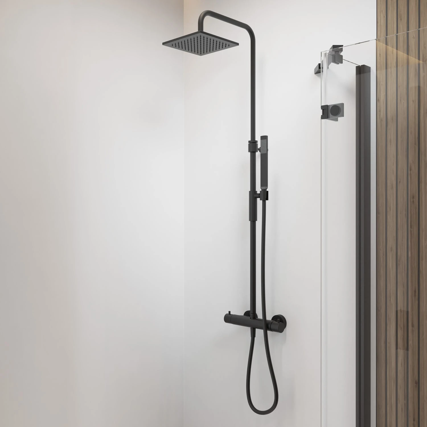 Artikeldetails: Duschlösung im eleganten italienischen Design mit geometrischer Formensprache edle matt schwarze Oberfläche für ihr modernes Bad einfache Bedienung durch getrennte Volumen und Temperatureinstellung Wasser-und Energiesparen durch ECO-Stop 50% Durchflussvolumen Sicherheitstaste bei 38° und thermostatische Regelung erhöhen die Sicherheit beim Duschen schnelle und sichere Montage mittels standardisierter Befestigung höhenverstellbar, bittet großen Freiraum unter der Kopfbrause wohlfühl Duschvergnügen mit großer Kopfbrause aus Metall 20×20 cm Stabhandbrause aus Metall in minimalistischem Design einfach zu reinigen durch flexible Silikonnoppen an Hand- und Kopfbrause geeignet für den schnellen Renovierungsfall Eigenschaften: Thermostat-Brausemischer mit 2 Ausgängen und Umsteller eckige Kopfbrause aus Metall 20 x 20 cm Stabhandbrause aus Metall flexibler Brauseschlauch 150 cm runder Brausehalter, höhenverstell- und kippbar Säule 360° drehbar
