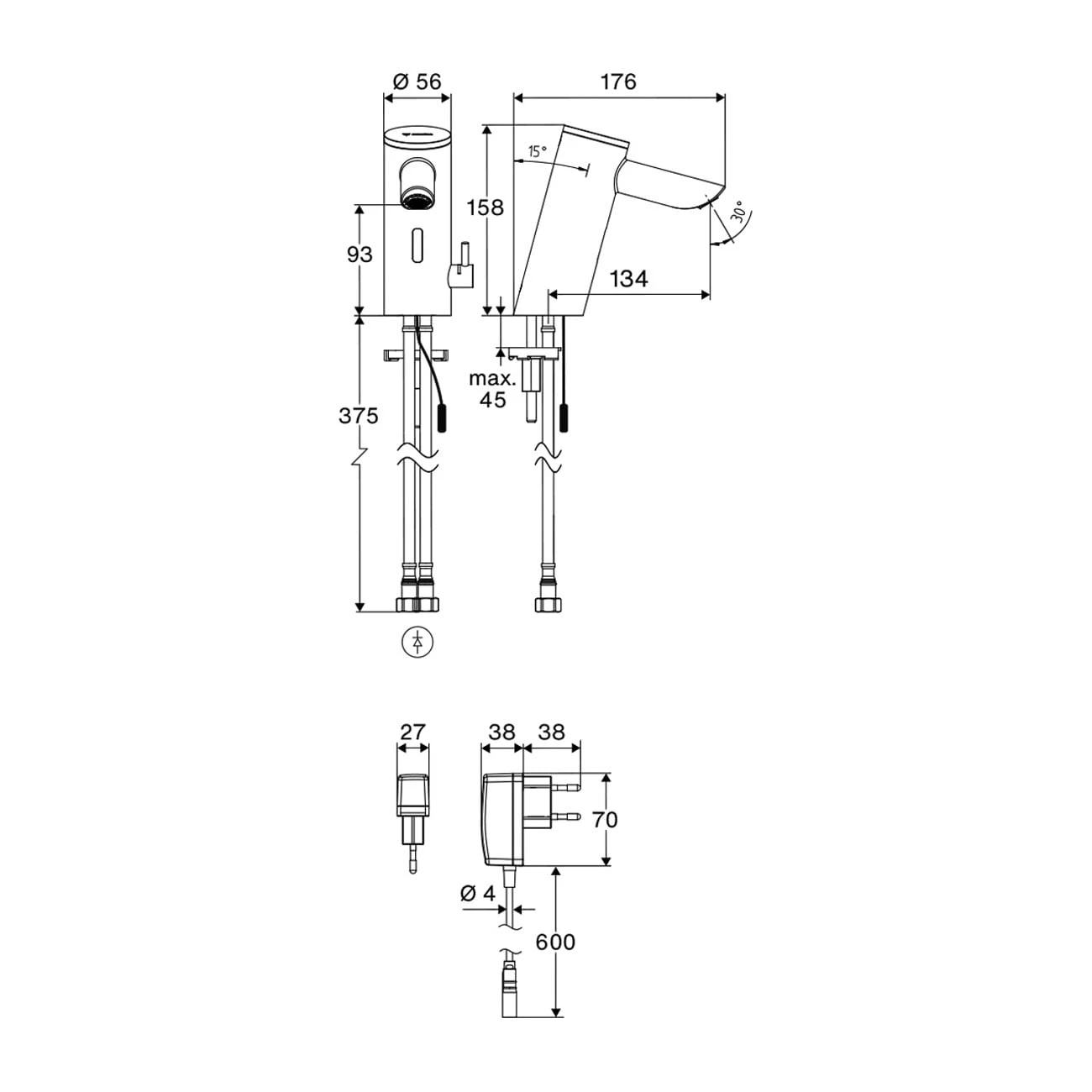 Eigenschaften: Time-of-Flight-Sensor-Einlocharmatur geeignet für Hochdruck Mischwasser Temperaturregler mit Heißwasserbegrenzung Time-of-Flight-Sensor-Elektronik (ToF) mit automatischer Justierung des Sensorbereichs berührungslose, sensorgesteuerte Armatur mit innovativer ToF-Technologie unempfindlich gegenüber reflektierenden Materialien wie z.B. Spiegeln, Warnwesten etc. mit verlängertem Auslauf 134 mm Axialmagnetventil 6 V mit Vorfilter Versenkter Strahlregler (diebstahlgeschüzt) mit integrierter Bluetooth®-Schnittstelle Parameter-Einstellungen über SCHELL App möglich geeignet zur Vernetzung mit SCHELL Wassermanagement-System SWS schnelle Parametrierung über voreingestellte Betriebsmodi (Strom sparen / Wasser sparen / Komfort) individuelle Einstellungen im Expertenmodus (Sensor-Reichweite, Sensor-Messintervall, Personenerkennung, max. Laufzeit, Nachlaufzeit) Stagnationsspülung (Aus / im Intervall / smartes bedarfsgerechtes Spülen unter Berücksichtigung der Nutzungen / zu festen Terminen [Tag(e), Uhrzeit]) Dauerspülung fürthermische Desinfektion, Auslösung per App (3 – 10 min) Dauerfluss, Auslösung per App (15 – 600 s) Reinigungsstopp, Auslösung per App oder Nahreflex (Aus / 60 – 360 s) inkl. Befestigungsmaterial für Waschtischmontage Technische Daten: Durchfluss: max. 5 l/min druckunabhängig Fließdruck: 1,0 – 5,0 bar Max. Ruhedruck: 8 bar Max. Betriebstemperatur: 70 °C (80 °C fürthermische Desinfektion) Anschlusskabel 220 mm, mit Steckverbinder 3-polig, Schutzklasse IP 65 Netzbetrieb, Steckernetzteil 9 VDC, 100 – 240 VAC, 50 – 60 Hz 2 flexible AnschlussschlÃuche Clean-Fix S G 3/8 IG x 410 mm, mit integriertem Rückflussverhinderer (RV, EN 1717: EB) und Vorfilter Werkstoff: Gehäuse Messing OberflÃche: chrom Anschluss: 2x G 3/8 IG Zertifikate: PA-IX 10332/IO, DVGW beantragt Geräuschklasse: I