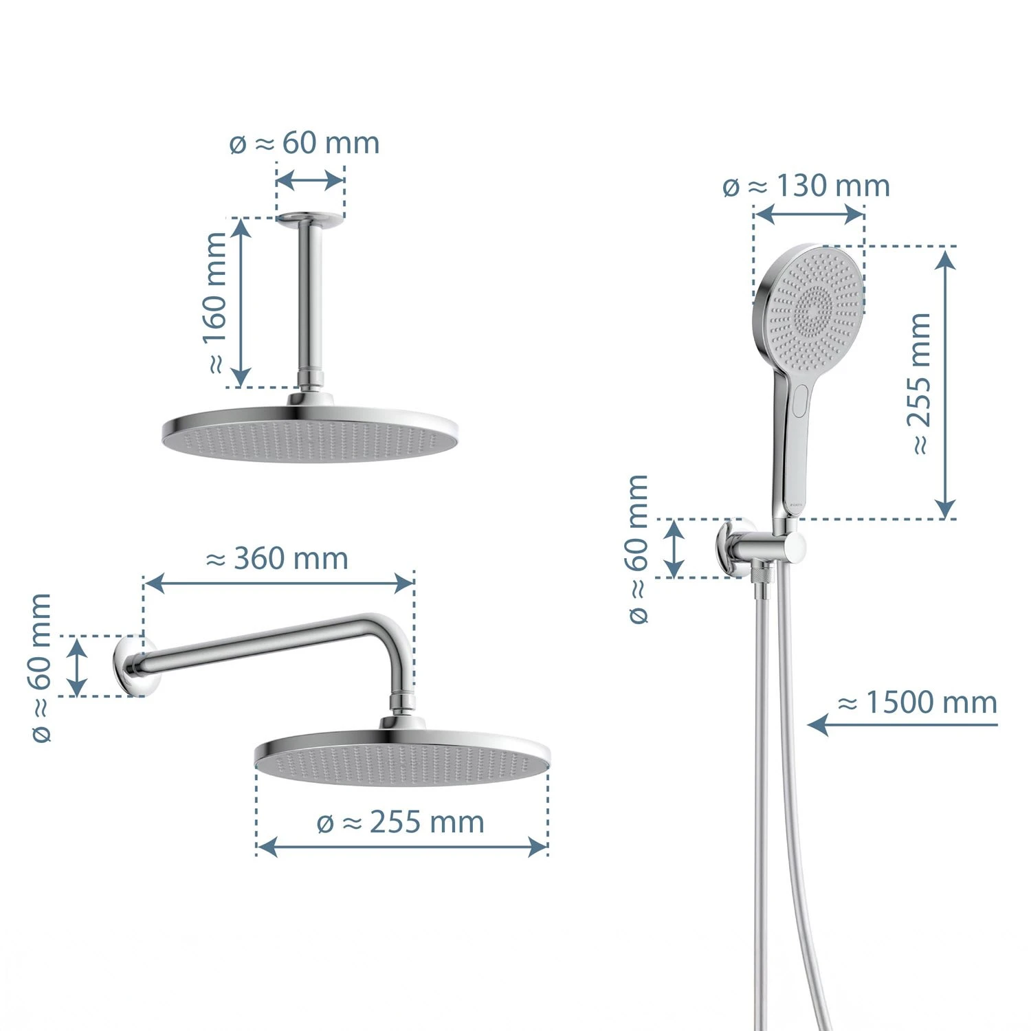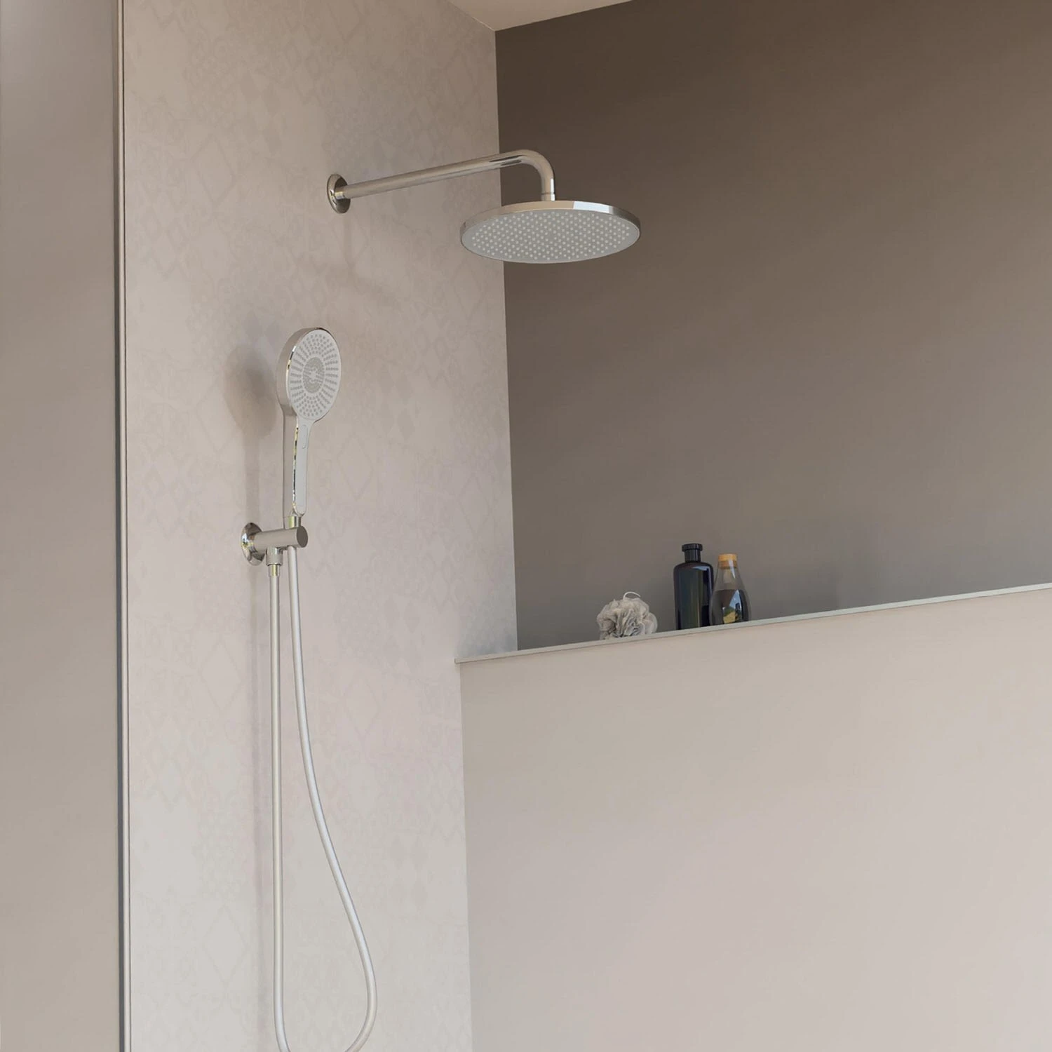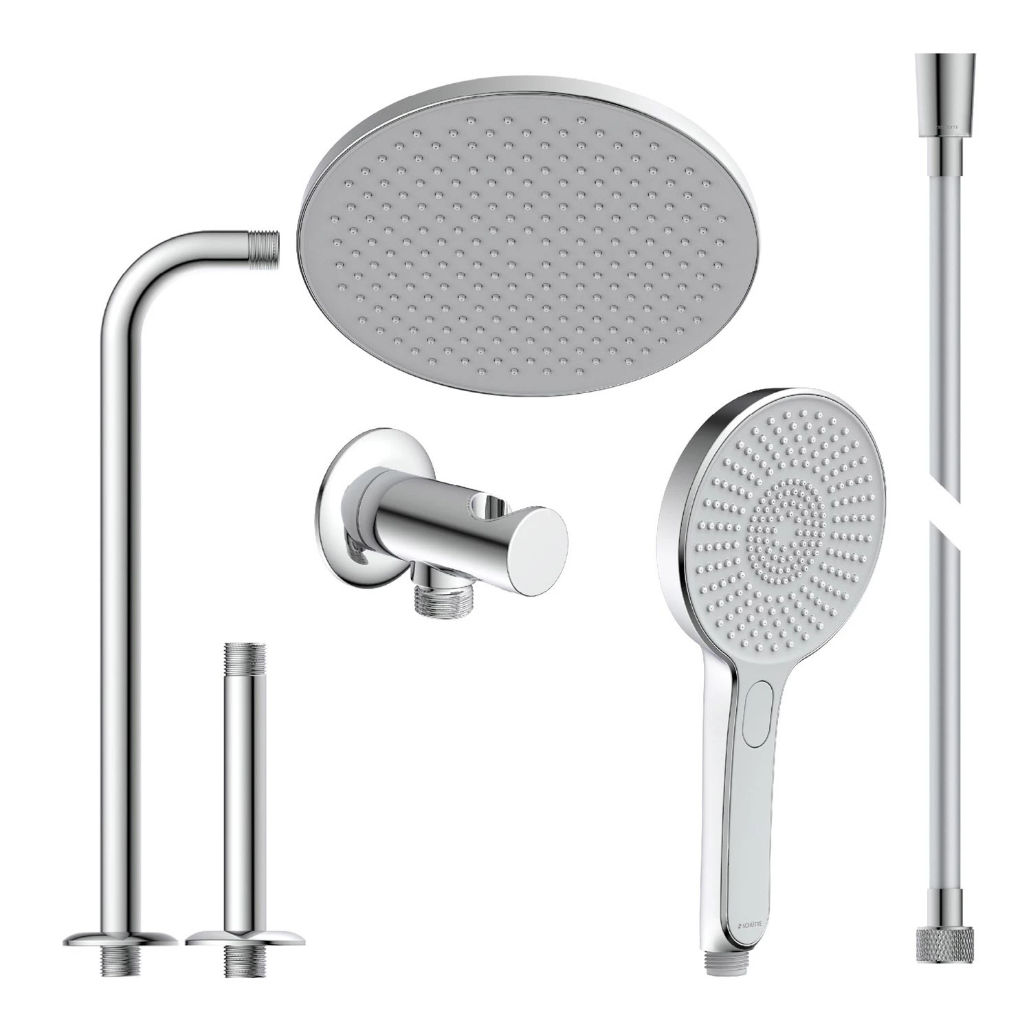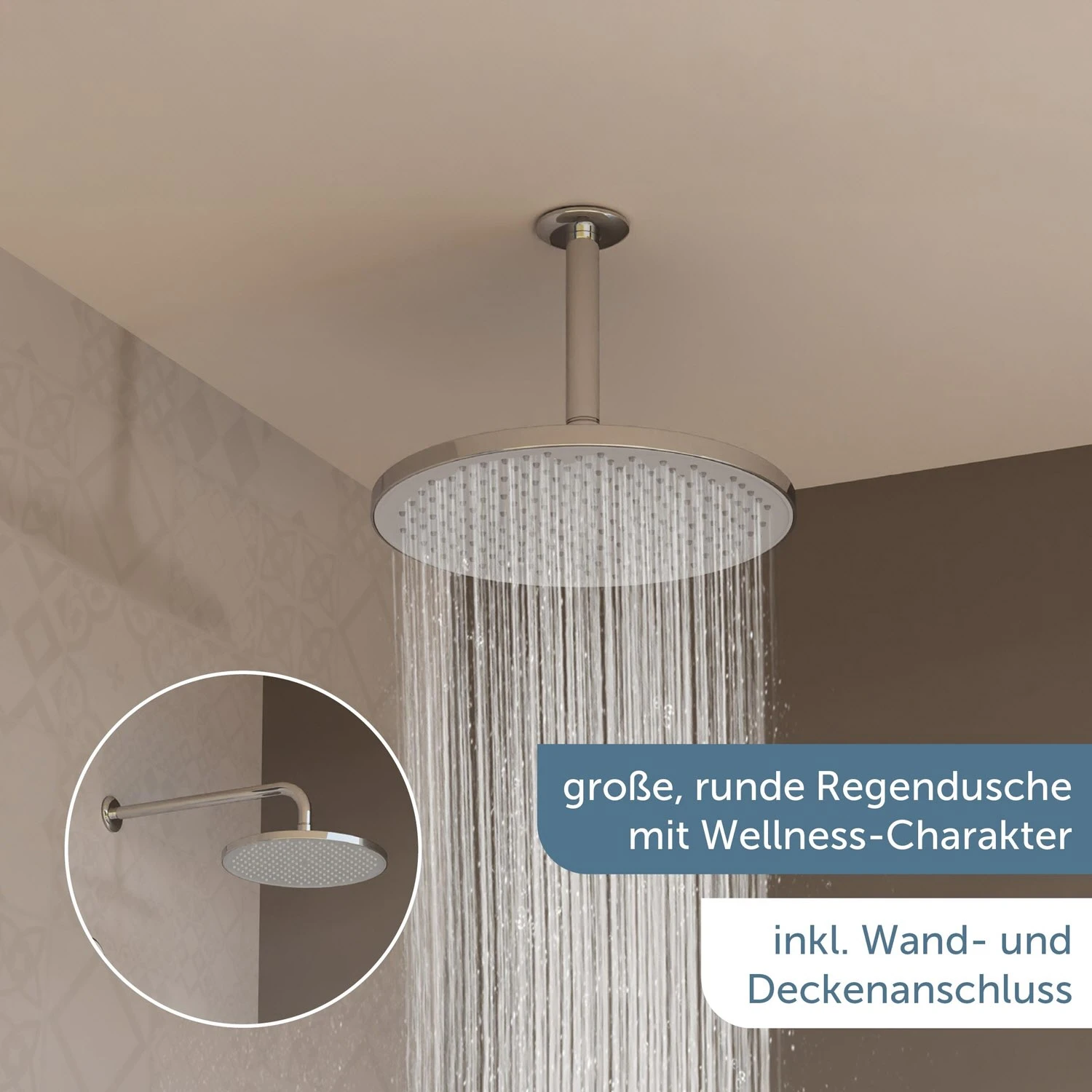 passend zu: dem Digitalen Duschsystem Set bestehend aus: Wellness-Kopfbrause, Größe: Ø ca. 26 cm, mit Samtstrahltechnologie, Antikalk-Noppen, ½“ (Ø ca. 1,9 cm) Anschluss Deckenanschluss, 16 cm, Unterputz-Deckenmontage, aus Edelstahl, mit Abdeckrosette, ½“ (Ø ca. 1,9 cm) Anschluss Anschlussbogen, 37 cm, Unterputz-Wandmontage, aus Edelstahl, mit Abdeckrosette, ½“ (Ø ca. 1,9 cm) Anschluss Handbrause, mit Samtstrahltechnologie, 3-fach verstellbar, mit Druckknopf zur Strahlartenumstellung, Antikalk-Noppen, ½“ (Ø ca. 1,9 cm) Anschluss, bis zu 50% Wasser sparen Brausehalter mit Schlauchanschluss, Unterputz-Wandmontage, aus Messing, ½“ (Ø ca. 1,9 cm) Anschluss Brauseschlauch, Länge: ca. 150 cm, Kunststoff, ½“ (Ø ca. 1,9 cm) Anschluss, inkl. Wasserspardichtung das entsprechende digitale Duschsystem ist nicht im Lieferumfang enthalten, bitte separat bestellen (s. Zubehör)