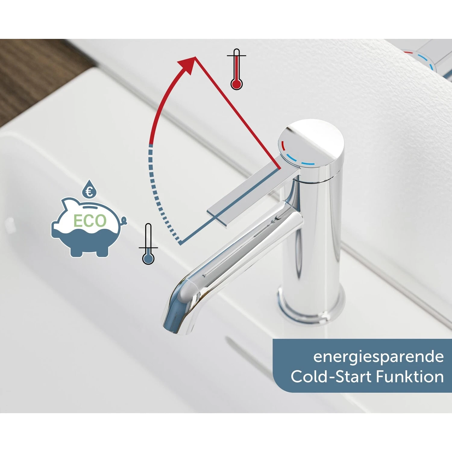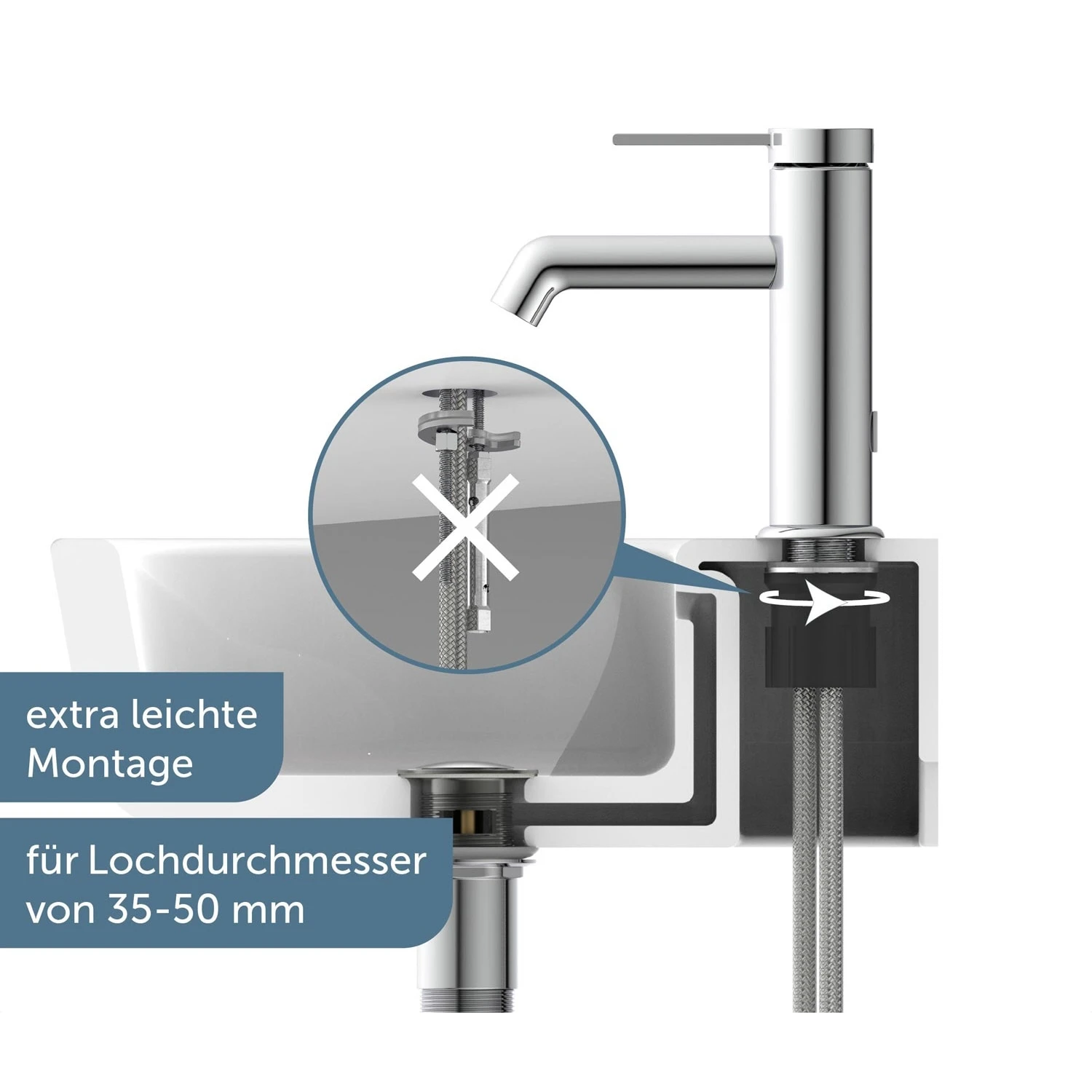 Eigenschaften: Eco-Click-Funktion — bis zu 50 % Wasserersparnis praktische Cold-Start-Funktion zum Energiesparen geräuscharme, auswechselbare 3,5 cm Keramik-Kartusche 1 ¼“ (Ø ca. 4 cm) Metall-Ablaufgarnitur Pop Up Lochbohrung für Exzenter vorhanden flexible Anschlussschläuche ca. 40 cm Marken-Mischdüse für ein perfektes Strahlbild Material: UBA Messing Anschlussart: M10 – 3/8” Armaturenart: Einhebelmischer mit Befestigungssatz inkl. Montageanleitung