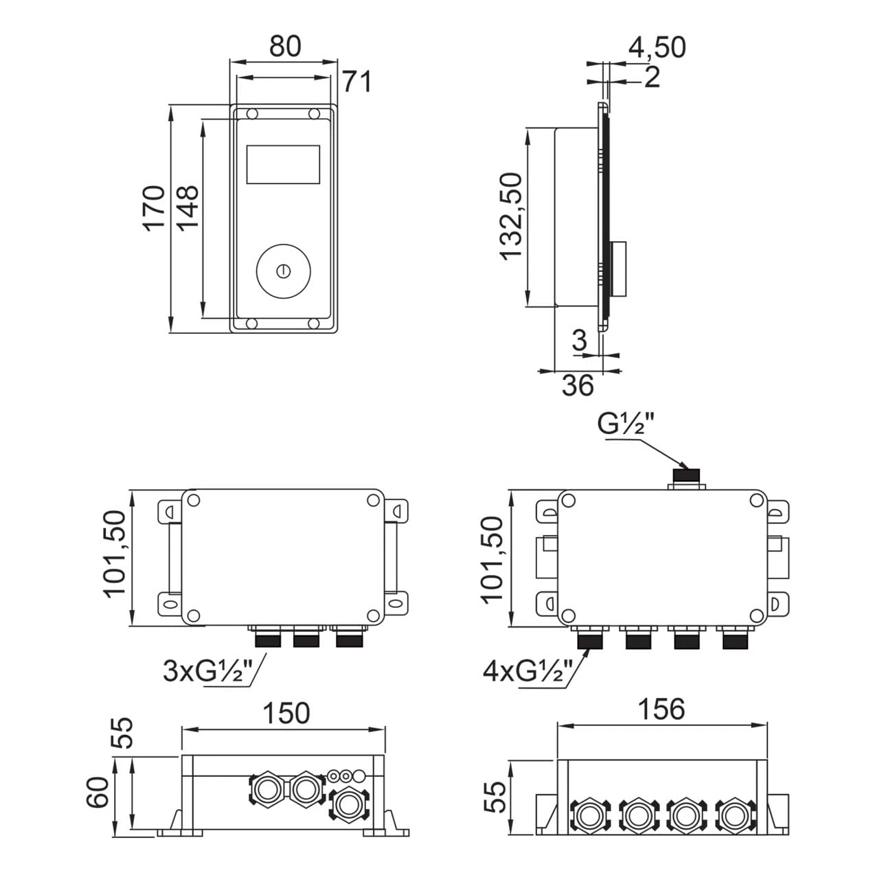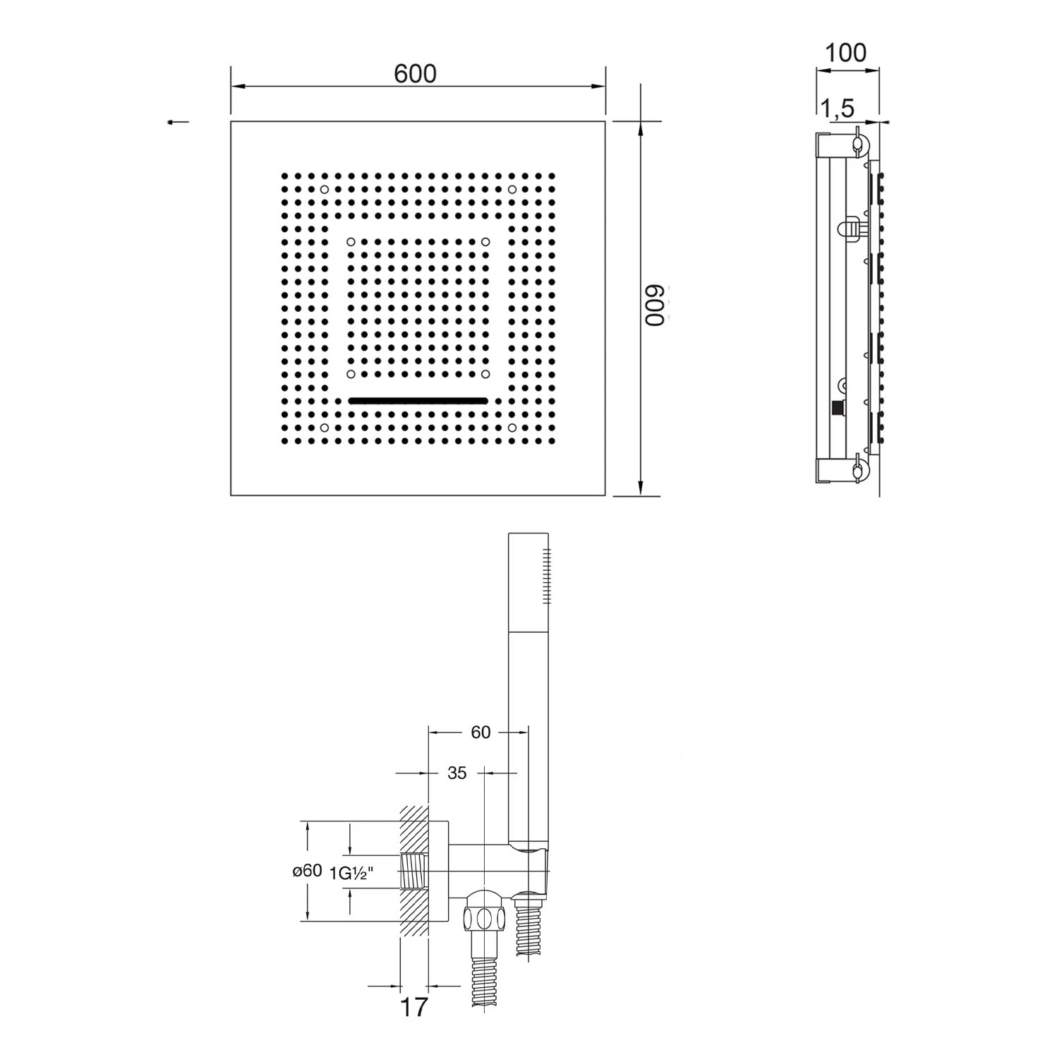 bestehend aus: Kopfbrause Sensual Rain „Wall Rain: 3 Strahlarten: Classic Rain (kraftvoll prasselnder Regenstrahl, ideal zum Haarewaschen), Curtain Rain (sanfter, umhüllender Regenstrahl), Waterfall (kräftiger, großflächiger Schwallstrahl) mit Easy-Clean-System langlebige Chromoberfläche, einfach zu reinigen langlebige LED-Beleuchtung (4 LED-Lampen) Netzteil 12 Volt, Nennstrom inklusive Einbaurahlem für Deckeneinbau Handbrause mit Brauseschlauch und Wandanschlussbogen mit Brausehalter: Strahlart: Classic (voller, wohltuender Strahl) Schlauch knickfest, flexibel, reinigungsfreundlich Brausehalter in den Anschlussbogen integriert eigensicher gegen Rückfließen Schlauch knickfest, flexibel, reinigungsfreundlich & mit Verdrehschutz Thermostat Sensual Rain „iFlow: Thermostat-Armatur mit Digitalanzeige elektronische Regelung der Temperatur durch Drehen für bis zu 4 Verbraucher geeignet, zum Beispiel Kopfbrause, Schwallbrause, Seitenbrause und Handbrause Aktivierung der Verbraucher über Display mit Softtouch-Symboltasten Position der Symbole ist fest Verbraucher einzeln aktivierbar Sicherheitssperre bei 38 °C schützt vor versehentlich zu heißen Temperaturen (voreingestellt) LED-Ring mit Farbverlauf zur Erkennung der Temperatur Wasserverbrauch: max. 25 Liter pro Minute (bei 3 bar) inklusive Montagekasten für Wandeinbau max. Wasserverbrauch der Handbrause bei 3 bar (l/min): 20,8 max. Wasserverbrauch der Kopfbrause bei 3 bar (l/min): 24,42 Mischeinheit zum Anschluss an Warm- und Kaltwasser: mischt die am Bedienelement eingestellte Wassertemperatur für den leicht zugänglichen Einbau in Verteilerschrank oder Wartungsklappe außerhalb des Duschbereichs inklusive Steuerungskabel zur Verbindung mit Thermostat-Bedienelement Umstelleinheit zur Ansteuerung der einzelnen Verbaucher: stellt den am Bedienelement gewählten Verbraucher ein für den Einbau in leicht zugänglichem Verteilerschrank oder Wartungsklappe außerhalb des Duschbereichs inklusive Steuerungskabel zur Verbindung mit Thermostat-Bedienelement inklusive Kennzeichnung der Verbraucher an den Ausgangsanschlüssen für einfache Montage inklusive Netzteil Hinweise: Mischeinheit und Umstelleinheit bitte zugänglich in einen Verteilerschrank (z..B. Waschtischunterschrank mit Türen) außerhalb des Duschbereichs montieren. Bei dieser Armatur ist die Regulierung der Wassermenge nicht möglich. Die digitale Anzeige bietet die Möglichkeit das Wasser an- oder auszuschalten. Elektrische Ausstattung nach deutscher Norm.
